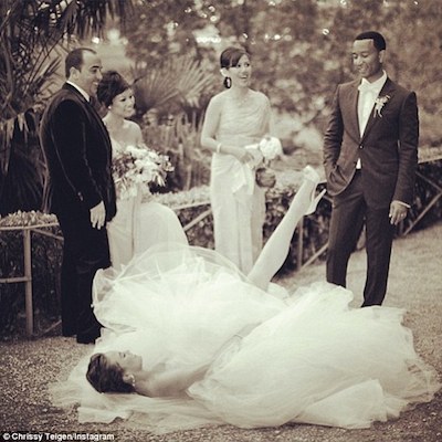 Love is in the air! This cute couple got married in front of a celebrity-studded audience in Lake Como, Italy. Model Chrissy Teigen changed three times over the course of the night, always wearing Vera Wang, always fitted to perfection. Her fun carefree attitude shows in the picture below - who else gets away with laying on the ground in a custom Vera Wang gown!? The groom looked equally dapper in a traditional 2-button charcoal suit with a notch lapel and a white lapel buttonhole (oh the details!). Later in the night, donning an unbuttoned loose-fitted shirt and slacks and losing the white silk bow-tie, he danced the night away with his beautiful bride. Love these two!